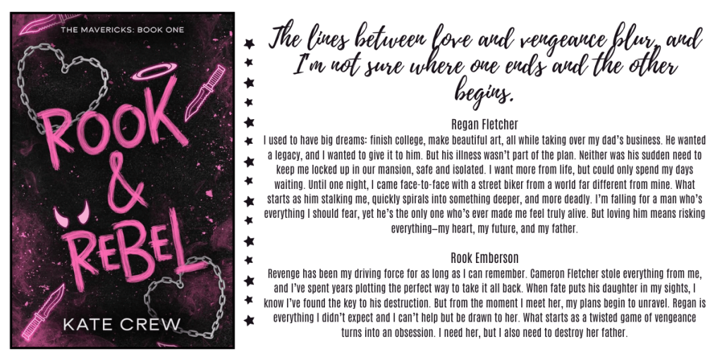 Rook & Rebel is the first book in The Mavericks series by Kate Crew. It is a (light)dark revenge romcom with similar vibes to Brynne Weaver’s Ruinious Love trilogy. It is not the same. They are both just spicy rom-coms with what some would perceive as darker elements. The Mavericks series revolves around a biker gang, with this book being about a member named Rook.