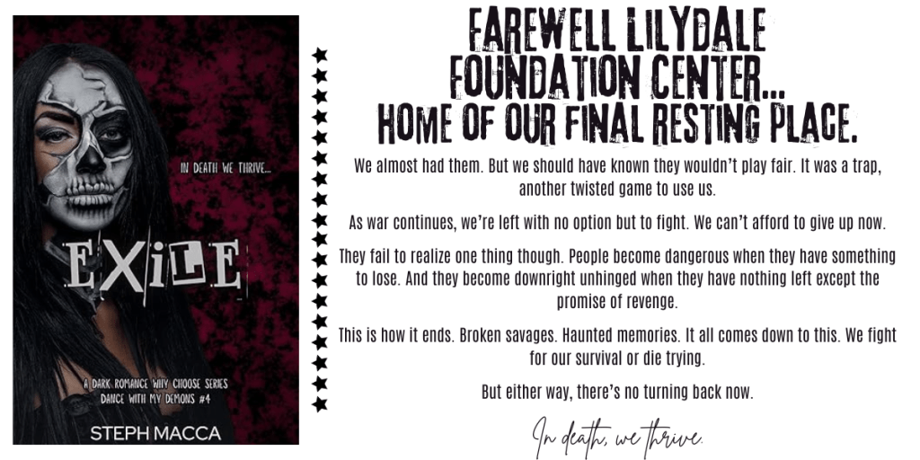 Exile is the final installment of Steph Macca’s Dance With My Demons dark why choose asylum romance. And this should come as no surprise, but I loved it. Following the formula set forth in the previous books, Exile picks up immediately after the Ravage ends. Honestly, one of the things I appreciated most about Exile, was the series recap at the start. In my opinion, more authors should be doing this.