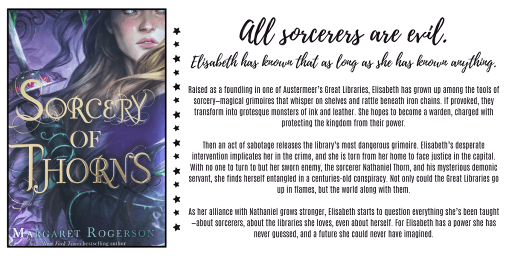 Are you hooked? Because I was. Sorcery of Thorns was stellar.  I gasped, I laughed out loud – If I was a crier, I’m sure I would have done that too.  Margaret Rogerson killed it with this stand-alone novel. Five months into the year & it is the best stand-alone I have read so far. The descriptions are dark, romantic and gritty. Rogerson gets right to the heart, horror and beauty of the magical world she creates. Invoking almost every emotion available with her words.