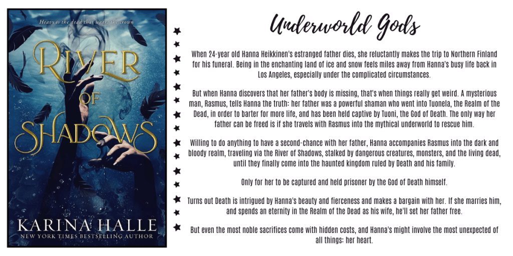 Take some Hades & Persephone, add some major Beauty and the Beast vibes, plus a dash of Labyrinth, and a sprinkle of Alice in Wonderland, and you have RIVER OF SHADOWS, a spicy and enchanting HIGH HEAT, HIGH FANTASY ROMANCE with a dark Nordic mythology twist.